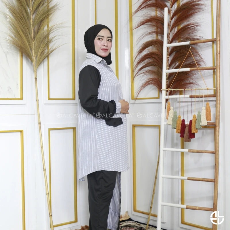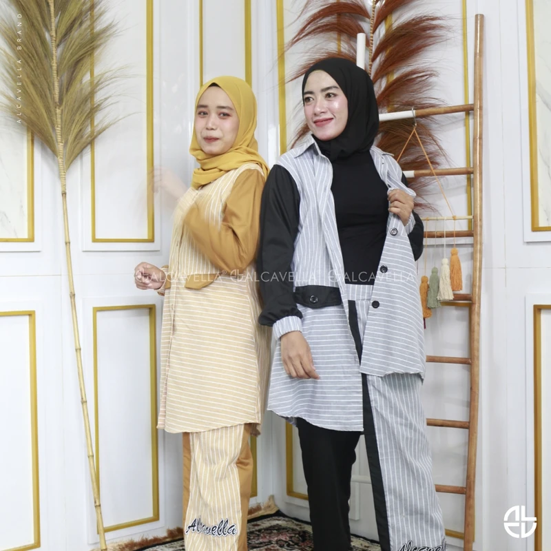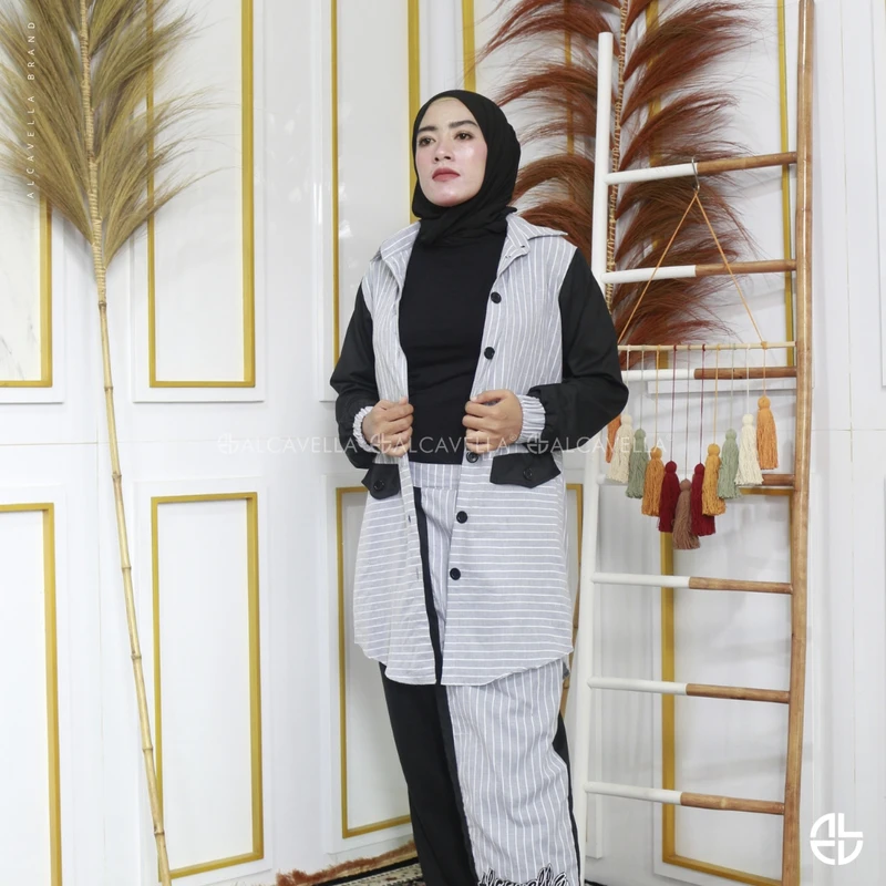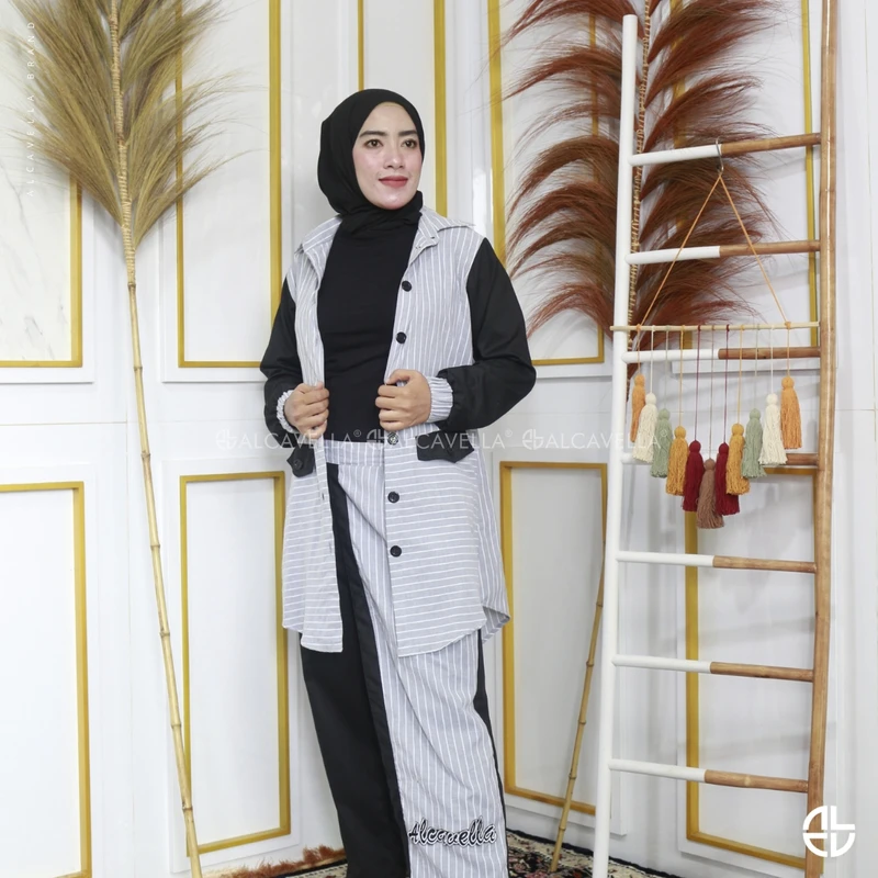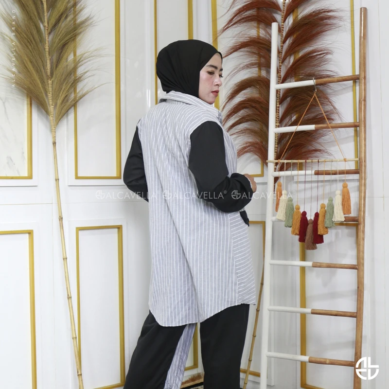 Alcavella Daily Wear Stripes dengan cuttingan design terbaru di bagian celana bikin tampilan kamu semakin kece, dari material Cotton Import Mix Toyobo yang lembut dan nggak gampang kusut. Simple dengan garis Vertical & horizontal yang wajib kamu miliki, dilengkapi teknologi Busui friendly dan wudlu friendly.