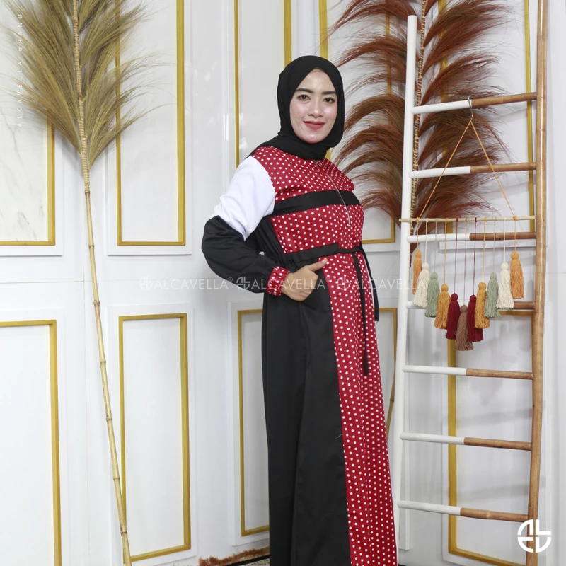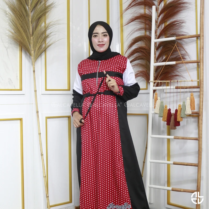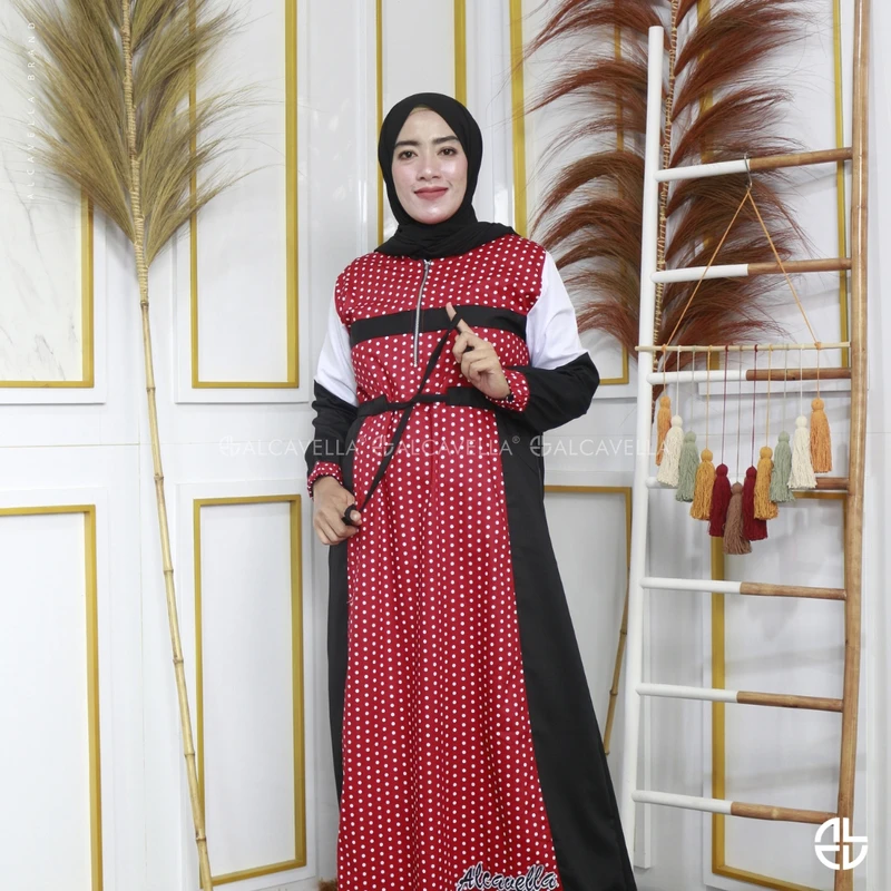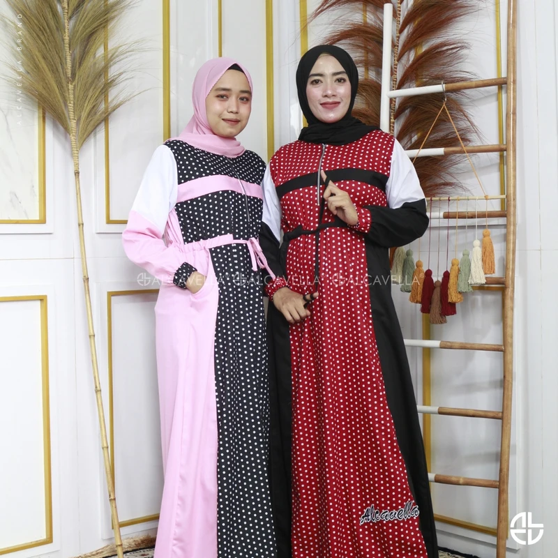 Dengan aksen tali serut, busui friendly, wudhu friendly, dan bordiran Alcavella di bagian bawah.