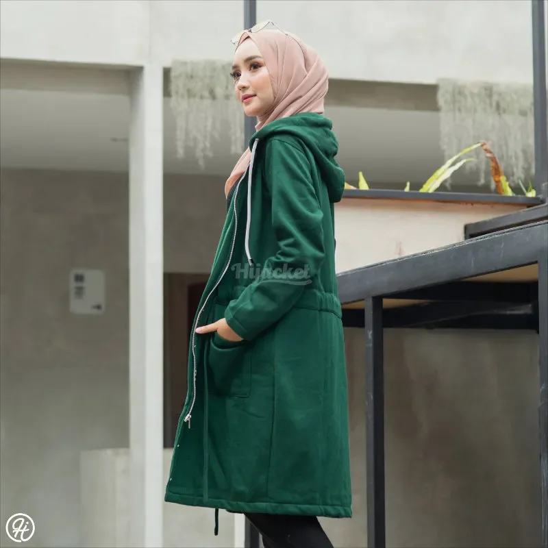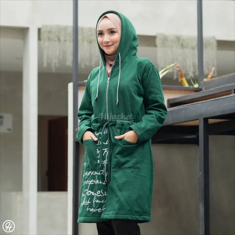 Model Hijacket ini didesain khas bergaya urban yang berkesan elegan bikin penampilan Anda tambah berwibawa. Cocok untuk wanita karir atau muslimah profesional. Dengan model modis, dipadu tulisan beberapa nama negara, kantong, dan tali kerut agar lebih stylish.
