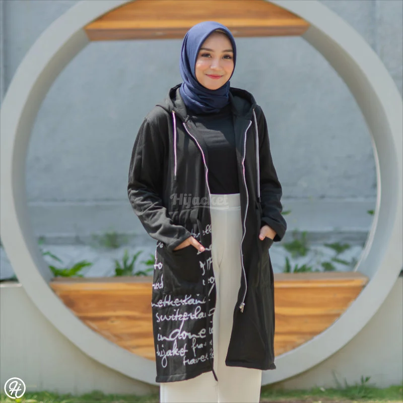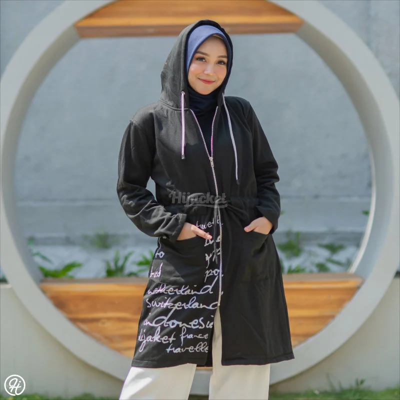 Model Hijacket ini didesain khas bergaya urban yang berkesan elegan bikin penampilan Anda tambah berwibawa. Cocok untuk wanita karir atau muslimah profesional. Dengan model modis, dipadu tulisan beberapa nama negara, kantong, dan tali kerut agar lebih stylish.