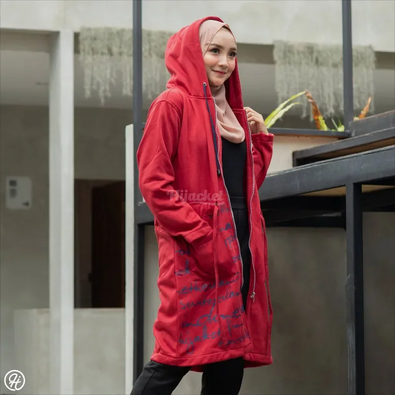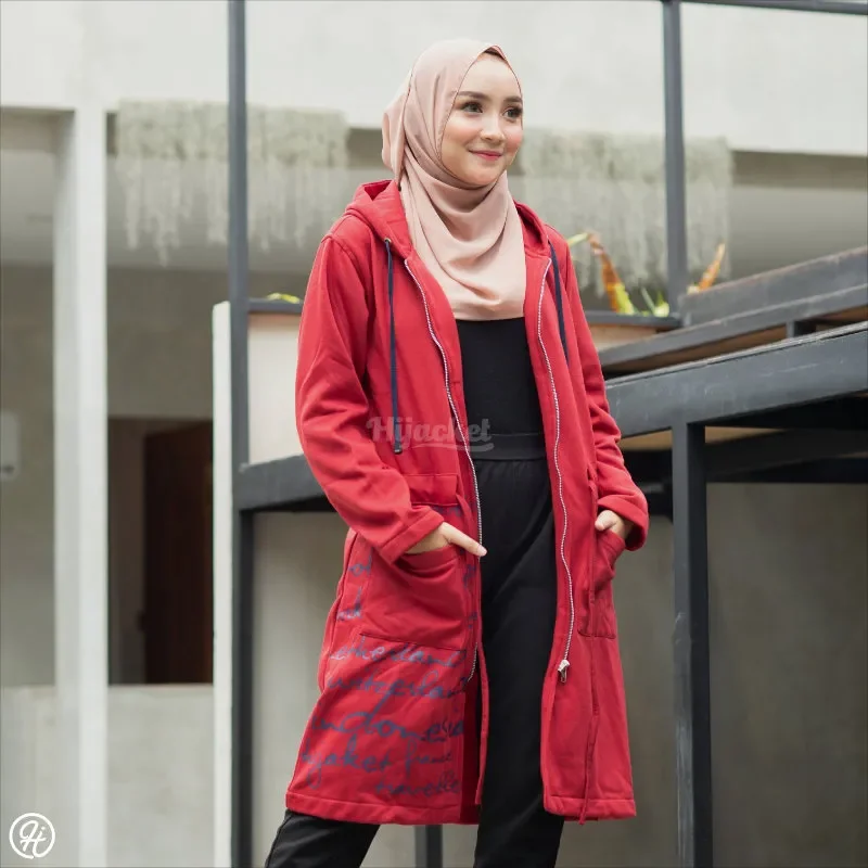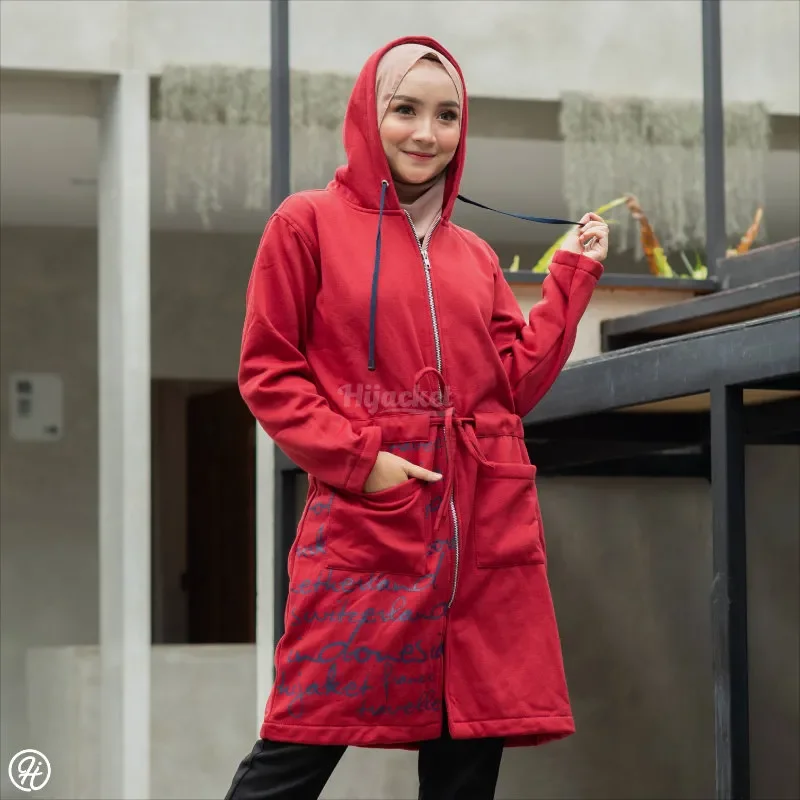Model Hijacket ini didesain khas bergaya urban yang berkesan elegan bikin penampilan Anda tambah berwibawa. Cocok untuk wanita karir atau muslimah profesional. Dengan model modis, dipadu tulisan beberapa nama negara, kantong, dan tali kerut agar lebih stylish.