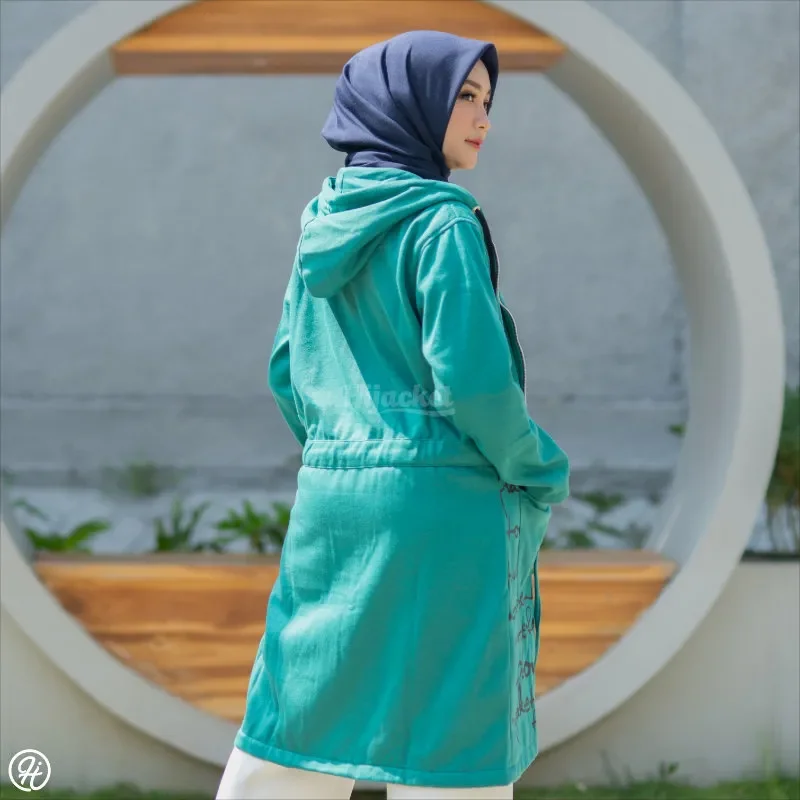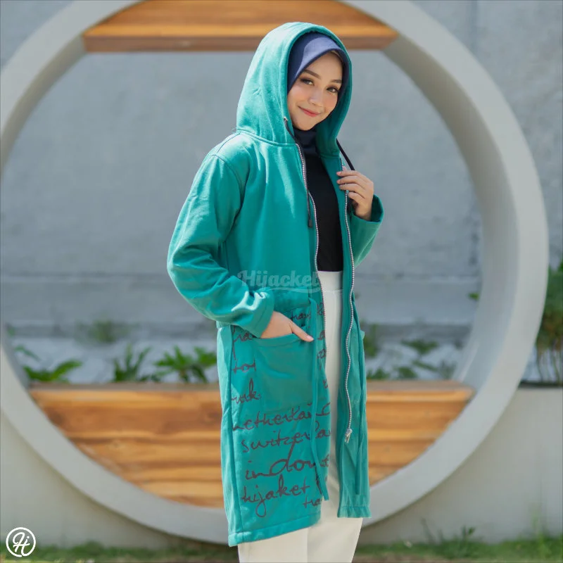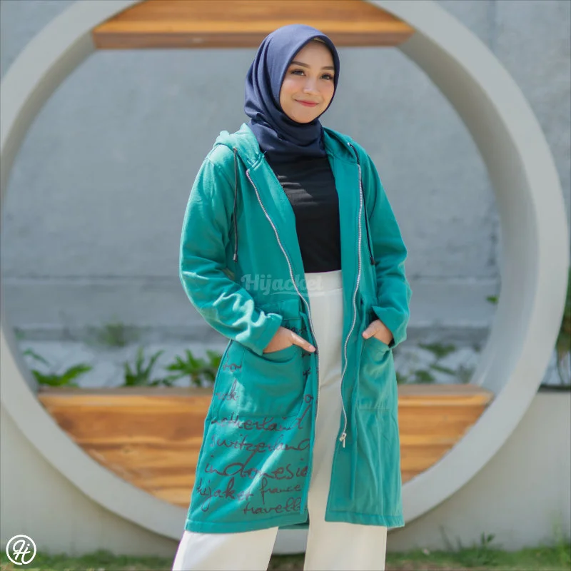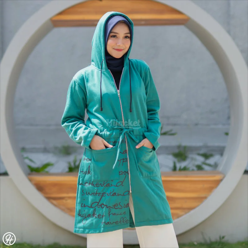Model Hijacket ini didesain khas bergaya urban yang berkesan elegan bikin penampilan Anda tambah berwibawa. Cocok untuk wanita karir atau muslimah profesional. Dengan model modis, dipadu tulisan beberapa nama negara, kantong, dan tali kerut agar lebih stylish.